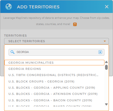 To add this territory, add a new territory from Mapline’s repository, type GEORGIA in the search bar, and select GEORGIA MUNICIPALITIES from the dropdown. Now, you’re ready to analyze data on a municipality-specific level.