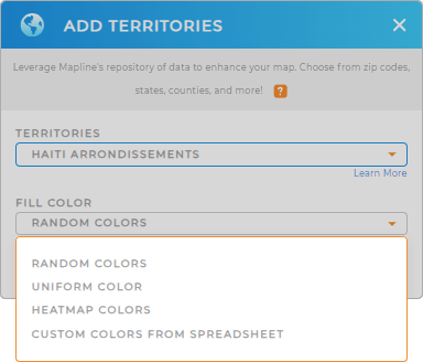 Enhance your analytic ability to identify market trends in each arrondissement within seconds! Just add a new territory from Mapline’s territory. Type HAITI in the search bar and click on HAITI ARRONDISSEMENTS.