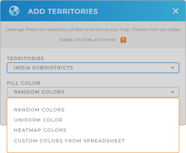 Add precise territory boundaries to your map in seconds! First, simply add a new territory from Mapline’s repository. Then, type INDIA into the searchbar and select INDIA SUBDISTRICTS from the drop-down.