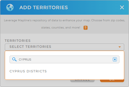 First, add a new territory from Mapline’s repository. Type CYPRUS into the searchbar and select CYPRUS DISTRICTS.
