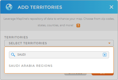 First, add a new territory from Mapline’s repository. Type SAUDI to the search bar to quikly select on SAUDI ARABIA REGIONS.