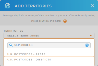 Add U.K. postcode areas to your map now and tailor your strategies to local markets! Unlock new opportunities for growth and efficiency by adding a new territory from Mapline’s repository, then type UK POSTCODES into the search bar and select UK POSTCODES- AREAS.
