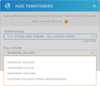 You’re just a few clicks away to add a new territory from Mapline’s repository! In the search bar, type CITIES AND TOWNS. There’s an option to choose ALL STATES. But if you want to focus on one particular state, you can choose that state with cities and towns.