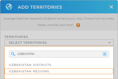 It’s so easy to add these boundaries to your map. All you need to do is to add a new territory from Mapline’s repository. In the search bar, type UZBEKISTAN and select UZBEKISTAN REGIONS.