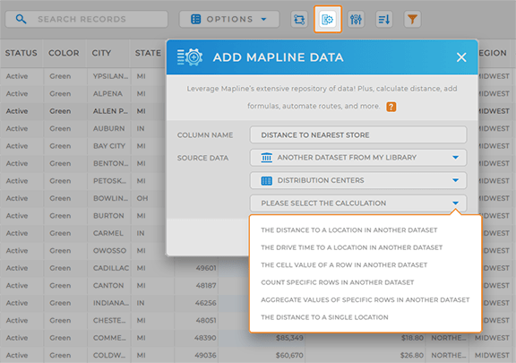 We’ll achieve this calculation by adding a new Mapline Data column to your dataset. Open your customer locations dataset and click the MAPLINE DATA ICON. Name your new column DISTANCE TO NEAREST STORE, then for the source data, select FROM ANOTHER DATASET and select your business locations dataset.