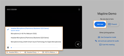 Below the video meet preview, you’ll see three drop-down menus for your microphone, speakers, and camera. Click each drop-down and ensure you have the correct inputs and outputs selected.