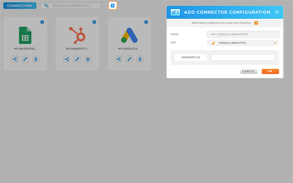 Now it’s time to bring your Google Analytics data into Mapline! Log into your Mapline account and look toward the top-right corner. See your name? Click on it and select CONNECTORS from the dropdown menu. This is where all your integrations live.